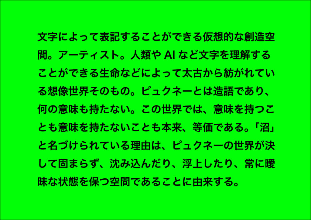 文字によって表記することができる仮想的な創造空間。アーティスト。人類やAIなど文字を理解することができる生命などによって太古から紡がれている想像世界そのもの。ピュクネーとは造語であり、何の意味も持たない。この世界では、意味を持つことも意味を持たないことも本来、等価である。「沼」と名づけられている理由は、ピュクネーの世界が決して固まらず、沈み込んだり、浮上したり、常に曖昧な状態を保つ空間であることに由来する。